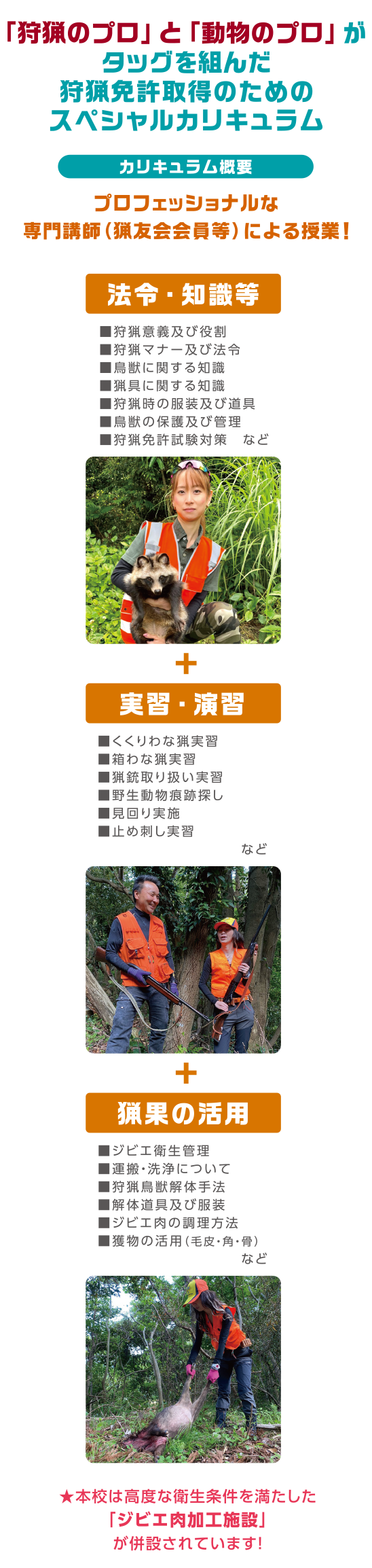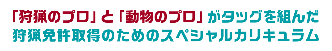 “わな猟”“銃猟”に特化した充実のカリキュラムによる「狩猟免許」の取得を通じて、「人と野生鳥獣の共生」に寄与できる人材を育ててまいります。