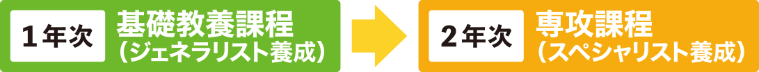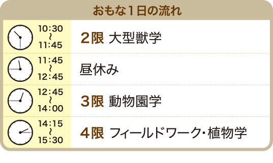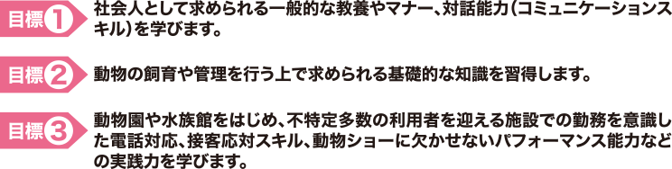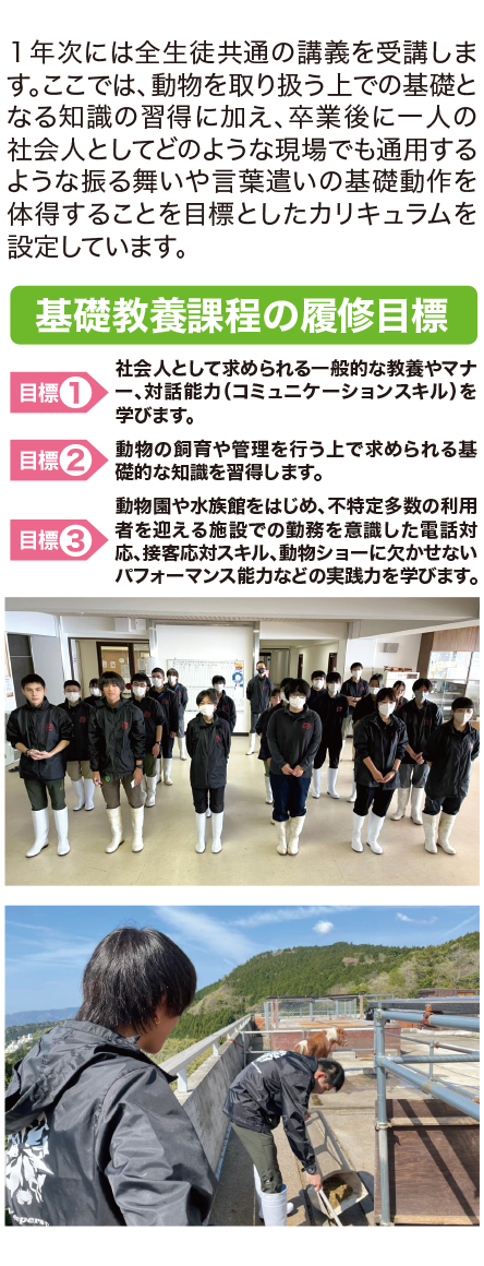 1年次には全生徒共通の講義を受講します。ここでは、動物を取り扱う上での基礎となる知識の習得に加え、卒業後に一人の社会人としてどのような現場でも通用するような振る舞いや言葉遣いの基礎動作を体得することを目標としたカリキュラムを設定しています。