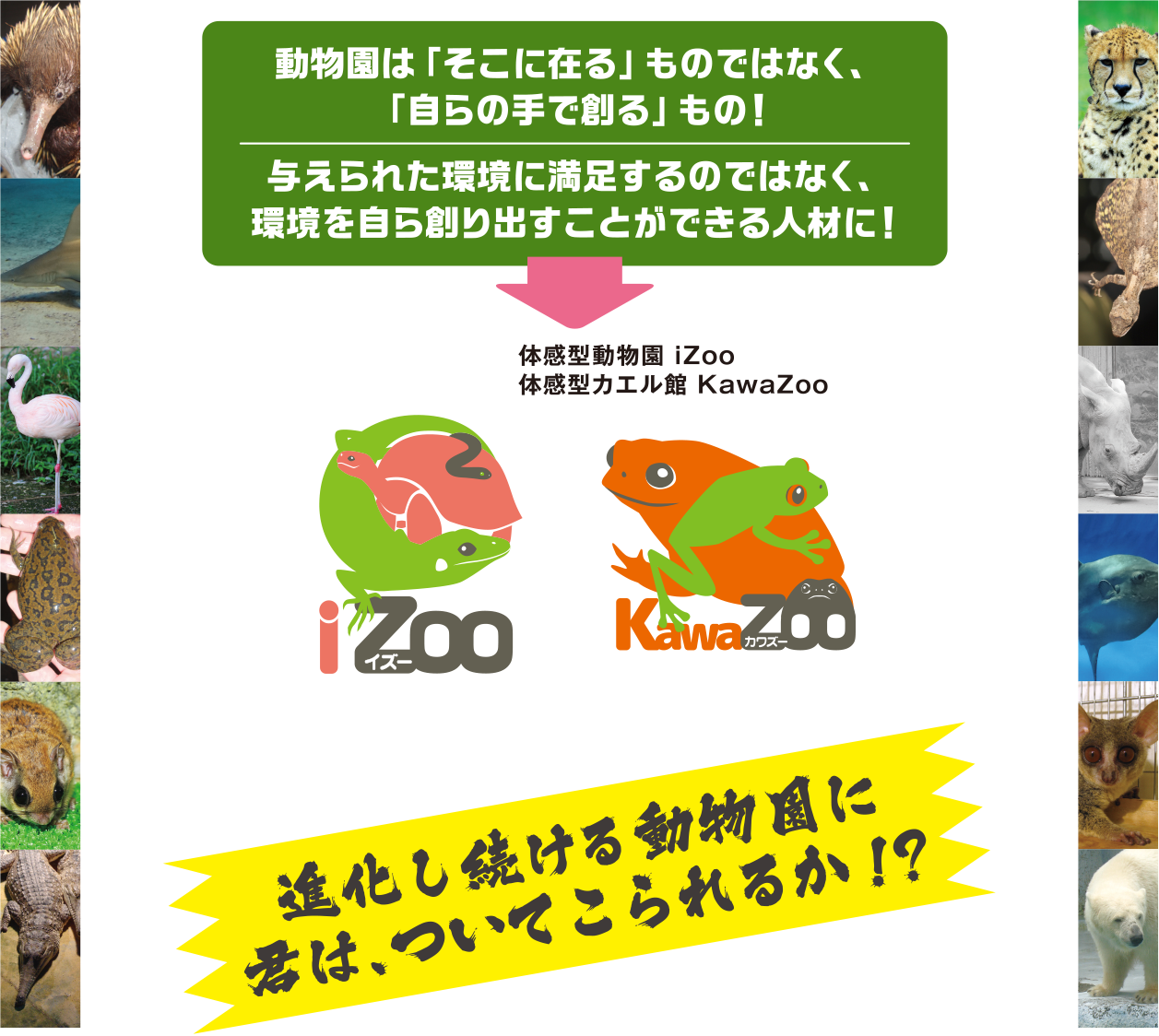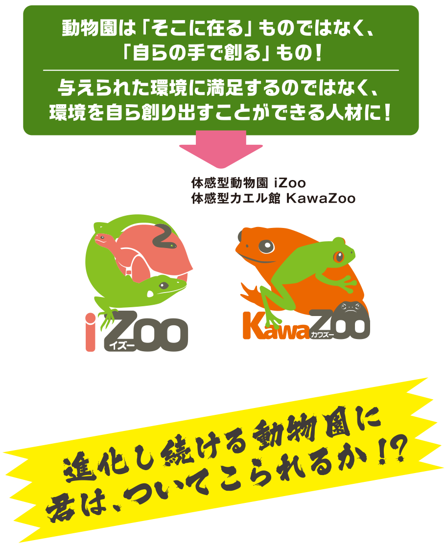 本校は、日本で唯一の爬虫類のみを展示する体感型動物園iZooを経営する有限会社レップジャパンが母体となっております。動物園の現場での「生」の授業は単なる体験ではなく、実践に即した動物園予備校的カリキュラムとして設定されています。
