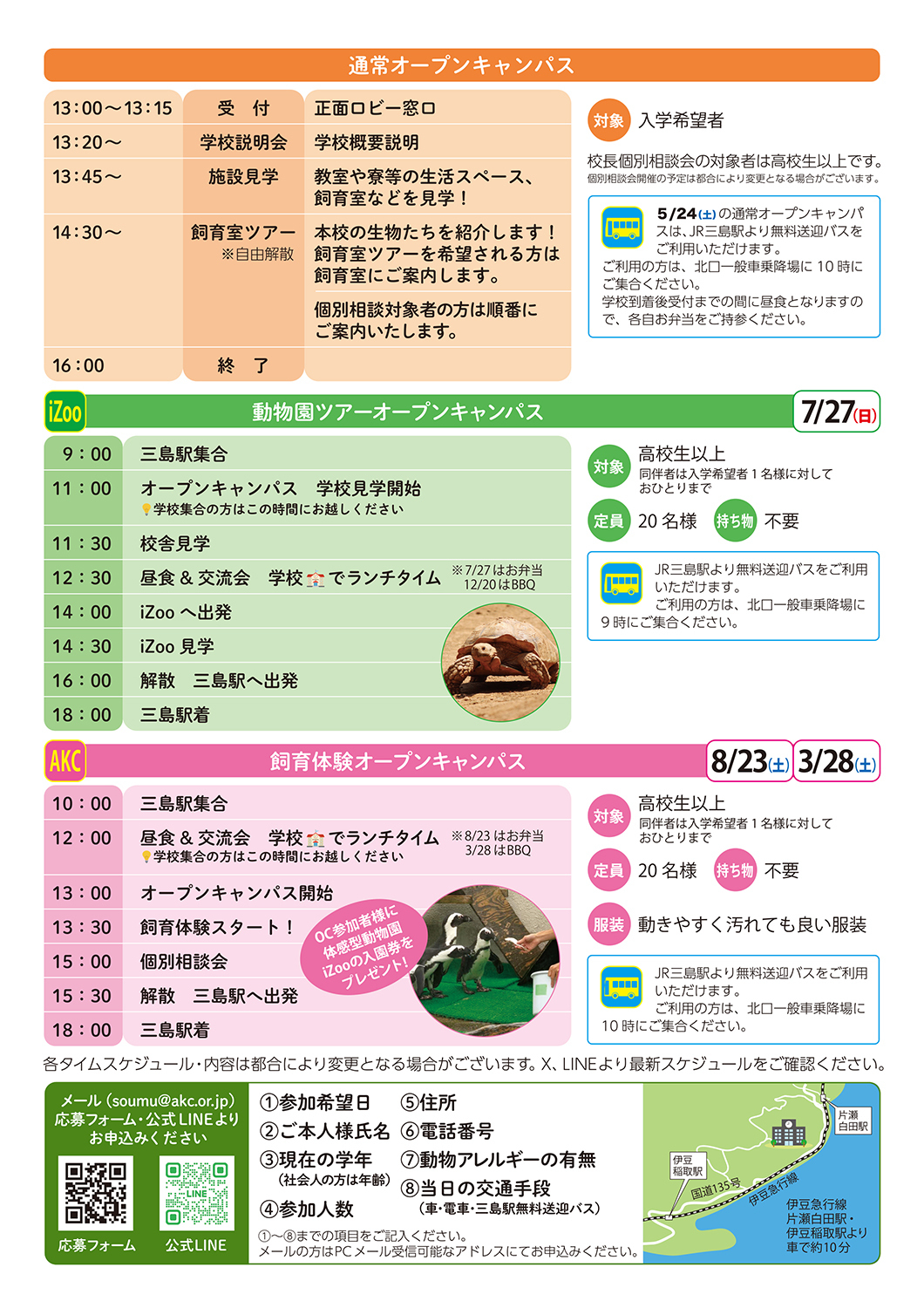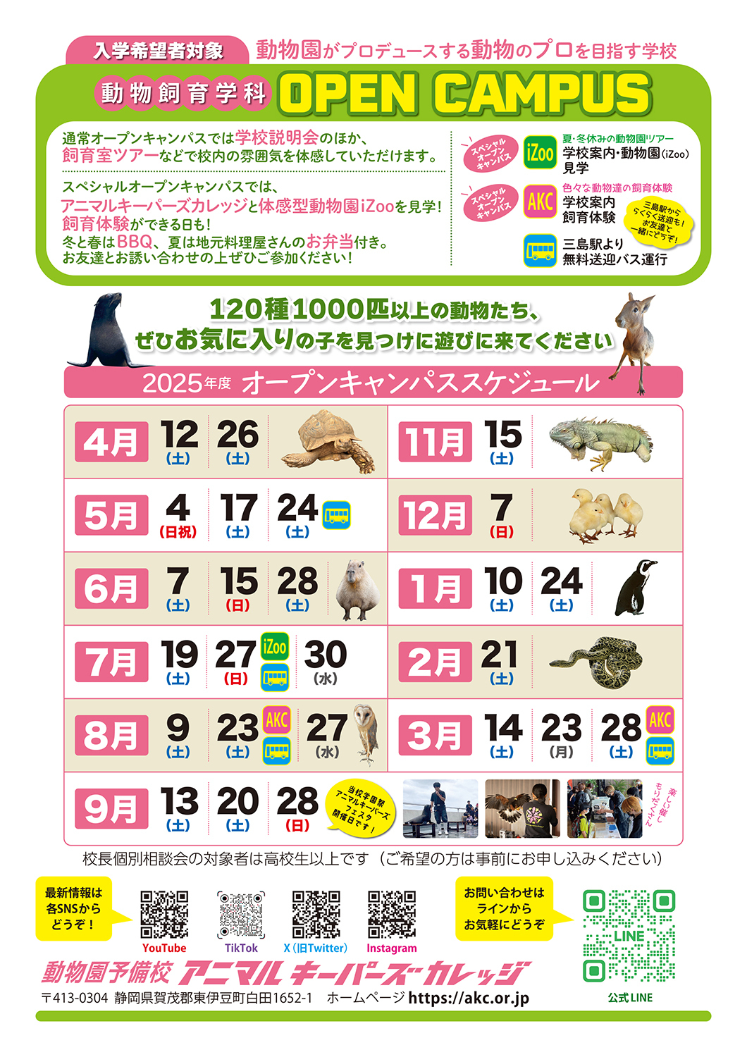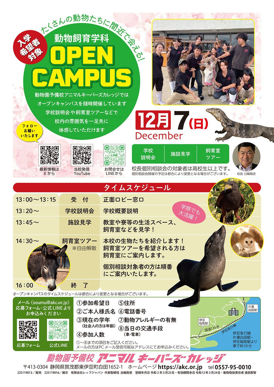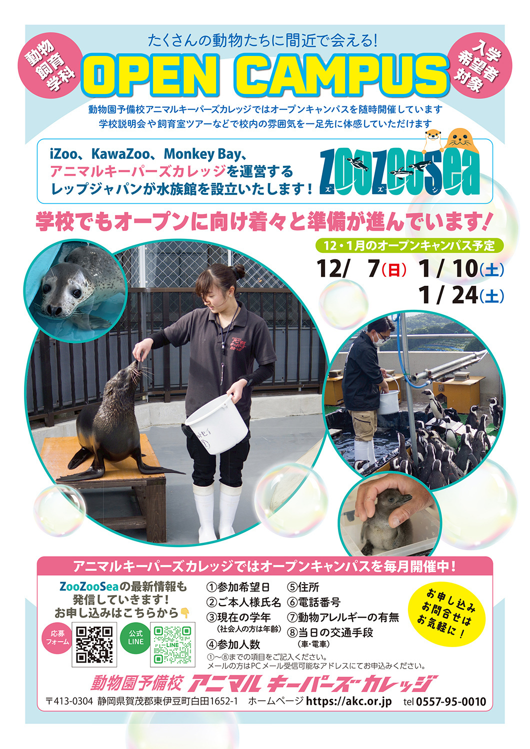 HOME | オープンキャンパスのお知らせ 動物予備校アニマルキーパーズカレッジでは ご入学を希望される方へ向けたオープンキャンパスを毎月開催しております。 お気軽にご参加ください。 画像をクリックすると資料が表示されます。 2025年12月開催 2025年12-2026年1月開催 年間開催スケジュール 内容のご紹介 令和7年度入学希望者対象 持ち物不要。保護者様のご参加もお待ちしております。 飼育室の見学があります。動きやすく汚れても良い服装でご参加ください。 オープンキャンパス参加を希望されている方で、 開催日程の都合が合わない方は別途ご連絡ください。